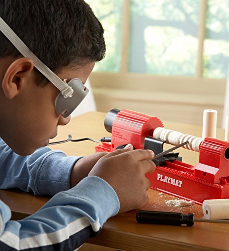 This totally safe working woodshop is a great way for kids to craft create build and otherwise discover skills that can provide a lifelong source of enjoyment. Young carpenters can turn out real wood works with this Cool 4 in 1 Woodshop Tool that’s a combination of jigsaw lathe drill press and sander. It differs from real carpentry equipment mainly in the number of built in safety features that protect kids from the possibility of injury. For ages 8 and up. For extra protection purchase plastic Safety Goggles separately. Includes: practice wooden dowels 4 wood samples power supply and deluxe project book.