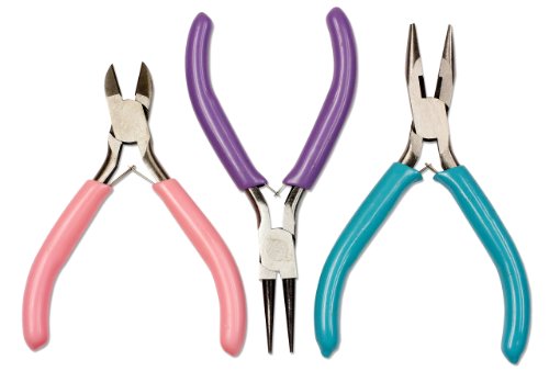 Jewelry crafters will love this convenient pack of essential tools Three tools in one pack includes a Needle Nosed Pliers with an aqua colored handle a Round Nose Pliers with purple handle and Side Cutters with pink handles