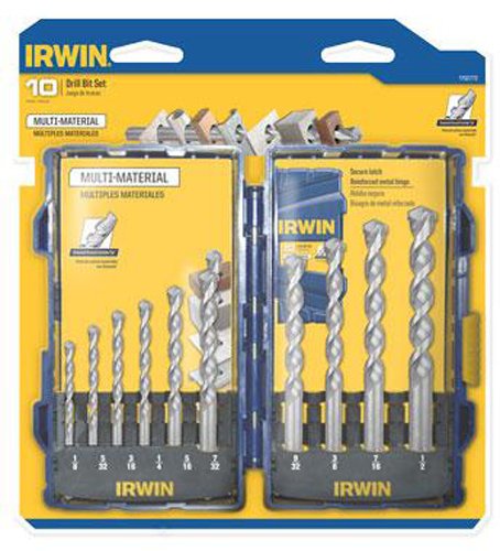 Irwin Tools 1792772 Multi Material Pro Set 10 Piece Durable carbide tipped constructionBrazed carbide tip has a unique diamond ground 4 face design for excellent centered starts with little walking and best hole qualityDouble ground flute ensures fast and efficient removal of the drilling dust and prevents cloggingSpecial duo tone surface finish reduces friction and resistance increasing bit life and drill battery lifeSpecial Grind Angle creates sharper tip edges for Fast starts in tough materials Product Description From the Manufacturer The Irwin Tools 1792772 10 piece Multi Material Pro Set (Contains One Each 1/8 Inch 5/32 Inch 3/16 Inch 7/32 Inch 1/4 Inch(2) 5/16 Inch 9/32 Inch 3/8 Inch 7/16 Inch) is designed to drill into a variety of materials. These bits will drill in brick block tile metal wood plastic and marble. The brazed carbide tip has a unique diamond ground 4 face design for excellent centered starts with little walking and best hole quality. The special Grind angle creates sharper tip edges for Fast starts in tough materials and the double ground flute ensures fast and efficient removal of the drilling dust and prevents clogging. The multi material but features a special duo tone surface finish that reduces friction and resistance therefore increasing bit life and drill battery life. Product Description Multi Material Drill Bit Designed For Drill In Brick Block Tile Metal Wood Plastic And Marble Size (In.) 1/8 In. 5/32 In. 3/16 In. 7/32 In. (2) 1/4 In. 5/16 In. 9/32 In. 3/8 In. 7/16 In. Shank Dia. (In.) 1/8 In. 5/32 In. 3/16 In. 7/32 In. (2) 1/4 In. 5/16 In. 9/32 In. 3/8 In. 7/16 In. Length (In.) 3 In. 3 1/2 In. 3/34 In. 4 In. (2) 4 In. 4 3/4 In. 4 In. 5 In. 5 In. Material 40 Cr. Steel For Use With Cordless Drills and Multiple Materials at One Time Durable carbide tipped constructionBrazed carbide tip has a unique diamond ground 4 face design for excellent centered starts with little walking and best hole qualityDouble ground flute ensures fast and efficient removal of the drilling dust and prevents cloggingSpecial duo tone surface finish reduces friction and resistance increasing bit life and drill battery lifeSpecial Grind Angle creates sharper tip edges for Fast starts in tough materialsMore Info and Reviews Manufacturer: Irwin Tools; Model: 1792772; MPN: 1792772; Part Number: 1792772; UPC: 038548994512; Color: Silver; Brand: Irwin Tools; Department: ; Size: Multiple; Warranty: ; Label: Irwin Tools; Amazon Sale Rank: 320945;Buy On Amazon