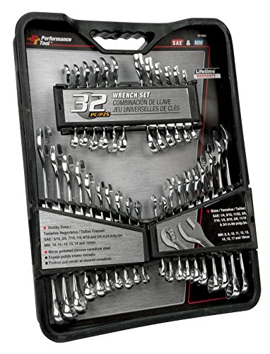 SAE and Metric standard and stubby wrenches. Mirror polished chrome vanadium steel. Improved box end design grips sides of fasteners for more torque. Includes convenient storage rack. SAE sizes: 1/4 5/16 11/32 3/8 7/16 1/2 9/16 5/8 11/16 and 3/4 inch. Stubby SAE sizes: 5/16 3/8 7/16 1/2 9/16 and 5/8 inch. Metric sizes: 6 8 10 11 12 13 14 15 17 and 18 millimeters. Stubby Metric sizes: 10 11 12 13 14 and 15 millimeters. Mirror polished chrome vanadium steelImproved box end design grips sides of fasteners for more torqueIncludes convenient storage rackSAE sizes 14in 516in 1132in 38in 716in 12in 916in 58in 1116in and 34inStubby SAE sizes 14in 38in 716in 12in 916in and 58inMore Info and Reviews Manufacturer: Performance Tool; Model: W1099; MPN: W1099; Part Number: W1099; UPC: 043953490597; Color: ; Brand: Performance Tool; Department: ; Size: 32pc SAE and Metric Wrench Set; Warranty: Lifetime; Label: Performance Tool; Amazon Sale Rank: 14400;Buy On Amazon