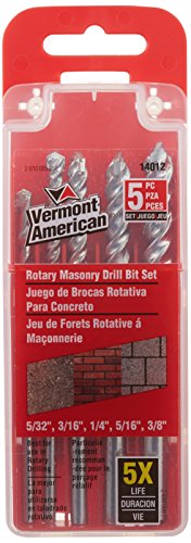 Vermont American’s 5 pice carbide tipped drill bit set includes the following bits: 5/32 inch 3/16 inch 1/4 inch 5/16 inch and 3/8 inch. The plastic storage case is also included. For drilling dry concrete masonry brick and tileFast spiral flutes quickly remove debris from holeCarbide tipped for long lifeLifetime Replacement PolicyA Vermont American product will provide complete satisfaction for the life of the product or it will be replaced free of chargeMore Info and Reviews Manufacturer: Vermont American; Model: 14012; MPN: 14012; Part Number: 14012; UPC: 045325140123; Color: ; Brand: Vermont American; Department: ; Size: ; Warranty: ; Label: Vermont American; Amazon Sale Rank: 234498;Buy On Amazon