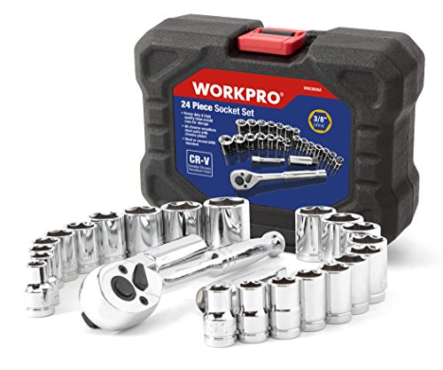 Durable blow molded case Ratchet dive handle sockets are manufactured from high grade chrome vanadium Cr v Steel heat treatedThe Set Includes10 piece 38 Dr SAE sockets 516 38 716 12 916 58 1116 34 1316 78 11 piece 38 Metric sockets 9 10 11 12 13 14 15 16 17 18 19mm 3 Extension bar 5816mm Spark plug 38 Ratcheting handle DurableThe Ratchet with Push button ball bearing quick release mechanism for easy and rapid socket change Forward reverse switch Non slip comfort grip handle for extra torqueCompact Blow Molded Case Specifically Designed layout keeps tool secure clean and organised Perfect for the serious DIY enthusiast or professionalMeet or exceed ANSI standard limited lifetime warrantyMore Info and Reviews Manufacturer: WorkPro; Model: FBA W003000A; MPN: FBA W003000A; Part Number: FBA W003000A; UPC: 798154047582; Color: Black; Brand: WORKPRO; Department: ; Size: 24 Piece; Warranty: ; Label: WorkPro; Amazon Sale Rank: 21817;Buy On Amazon