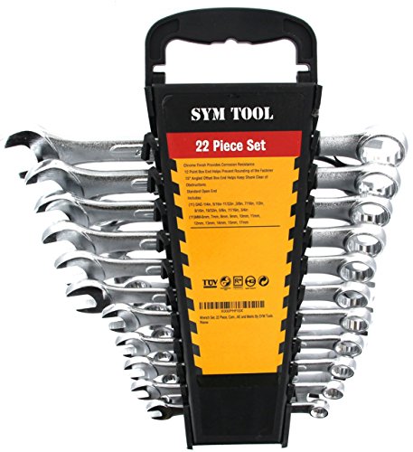 Why buy from SYM Tools Our product development team strives to bring you the highest quality tools at affordable prices. We stand behind our products and we want you to be pleased with your purchase. Please contact us through Amazon with any questions or concerns. We’d love to hear from you! 22 PIECE WRENCH SET BY SYM TOOLS SYM Tools is committed to providing you with the best possible purchasing experience Let us know how we can helpDUAL SIZING SAE and Metric units for versatile use With so many different sizes you will always have the correct wrench on hand SEE EXACT SIZING IN DESCRIPTION BELOWQUALITY Drop Forged Steel construction for strength and durability with a chrome finish for corrosion resistanceEASE OF USE 12 point boxed end for added torque There is also an offset of 15 degrees to create access space for your fingers and to keep the shank clear of obstructionsSTAY ORGANIZED This set comes with a sleek carrying case storage box to keep all 22 pieces in place You can easily locate the size you need without having to rummage through an endless mess of tools The carrying handle makes this easily portable and storableMore Info and Reviews Manufacturer: SYM Tools; Model: ; MPN: SYM 2848; Part Number: SYM 2848; UPC: 039409234020; Color: ; Brand: ; Department: ; Size: ; Warranty: ; Label: SYM Tools; Amazon Sale Rank: 1419;Buy On Amazon